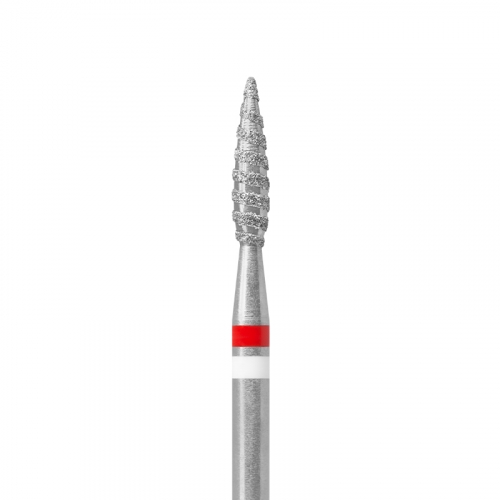 Алмазная фреза 856.104.242.100.023 изготовлена на Казанском заводе медицинских изделий «Кристалл» (г.Казань). Форма – торнадо, пламя острое со смещенным центром и увеличенной площадью рабочей части, каплевидная, насечка – красная, мягкая, абразивная поверхность состоит из 100% - ных калиброванных алмазных кристаллов,разряженных мелкими керамическими жемчужинами. Они обладают превосходными адгезионными свойствами к металлическим связкам, что обеспечивает идеальную фиксацию на рабочей части фрезы и полностью исключает их выпадение. Высокая механическая прочность жемчужин обеспечивает их целостность при работе по коже. Фреза предназначена для nail-мастеров и подологов. Изготовлена из высококачественных материалов, не подвержена коррозии. Размер керамических жемчужин варьируется от 5 до 200 микрон (в зависимости от формы фрезы). Огнеупорность до 1800 градусов по Цельсию, что позволяет подвергать изделие всем видам стерилизации согласно СанПин. Фреза проста и надежна в эксплуатации и поддается любым видам стерилизации и дезинфекции. Индивидуально упакована в блистер. Особенность: рабочая часть фрезы покрыта алмазной крошкой в виде спирали, благодаря чему опил не измельчается в пыль, а скатывается по спиралям фрезы. Это сокращает время обработки и позволяет избежать неприятных ощущений от нагрева фрезы.