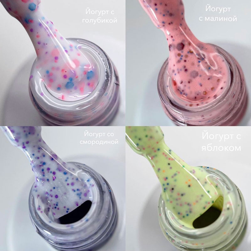 90% оттенков имеют плотный стабильный пигмент. Каучуковая основа, пластичные. Сочетаются с базами и топами других фирм. Средняя консистенция, не текут. Имеют остаточную липкость. Сушить в УФ 2 минуты, в ЛЕД 1 минуту.